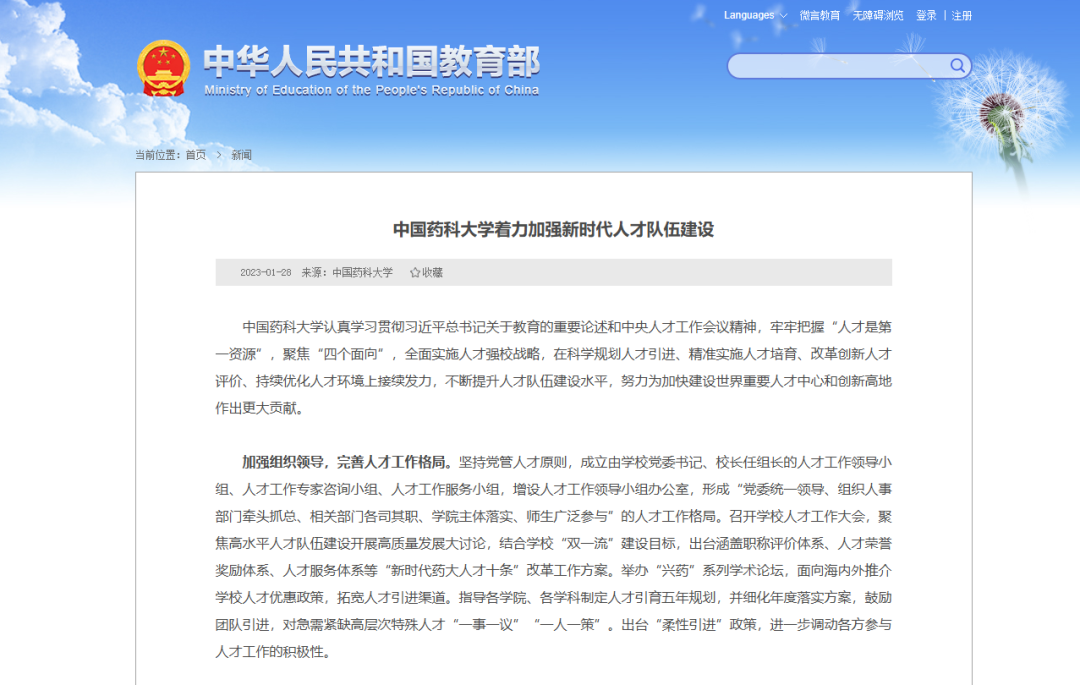 “大力推进‘人才特区’建设,探索‘进人自主、培养自主、考核自主、晋升自主’政策,实行‘按需设岗、明确目标、择优支持、聘约管理、动态调整’的管理模式。”2023年1月28日,教育部网站以“中国药科大学着力加强新时代人才队伍建设”为题专题报道我校人才工作。