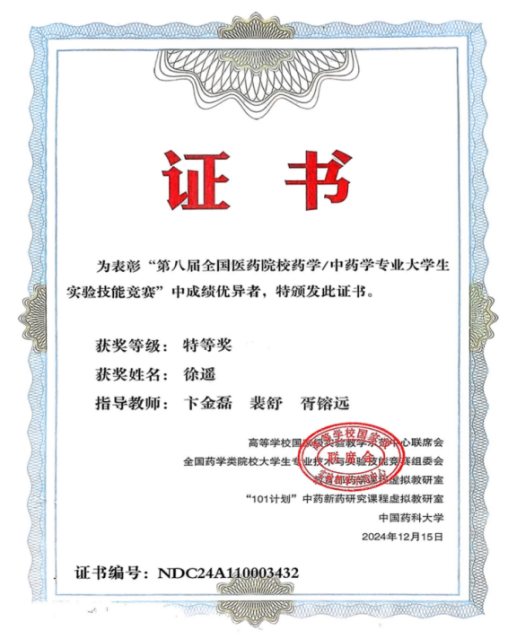 第八届全国医药院校药学/中药学专业大学生实验技能竞赛特等奖