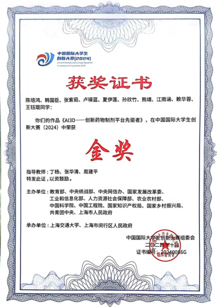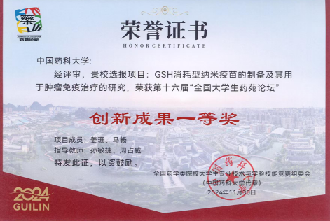 第十六届“全国大学生药苑论坛”创新成果一等奖