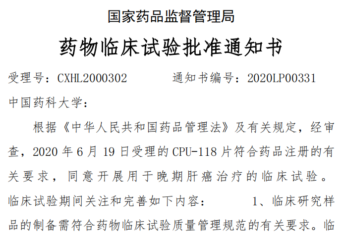 李志裕教授合作研发CPU-118片获1类新药临床批件