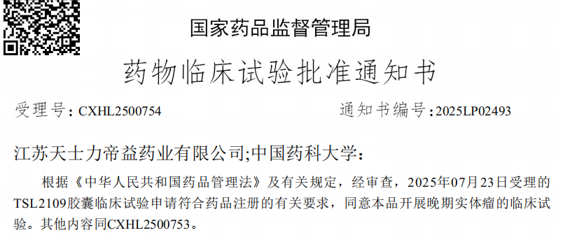 杨鹏教授合作研发TSL2109胶囊获1类新药临床批件