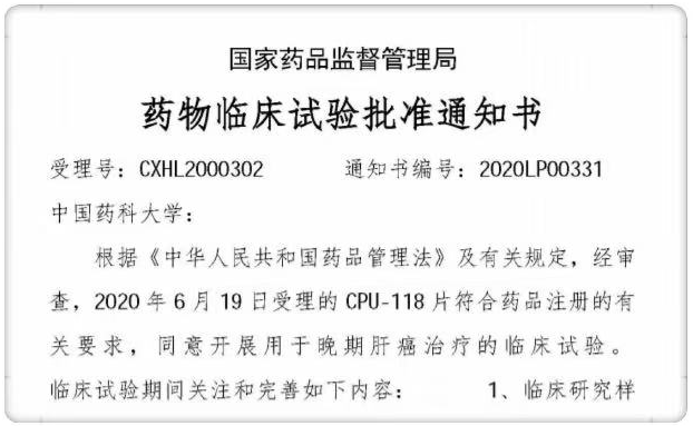 郭青龙教授合作研发CPU-118片获1类新药临床批件