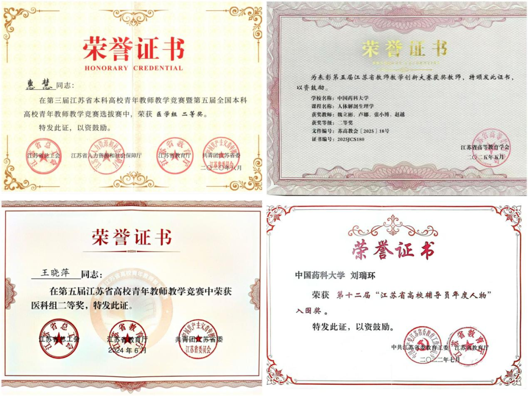 教育教学成果显著,本科临床药学专业入选国家级一流专业建设点、江苏高校品牌专业建设工程和校产教融合型品牌专业。拥有江苏省一流本科课程2门、全国药学专业学位研究生精品课程1项、全国药学专业学位研究生在线示范课程2门、教育部认证学堂在线MOOC课程1门。获江苏省高等教育教改研究立项课题2项、全国药学专业学位优秀教学案例2项、江苏省研究生优质教学资源2项;获全国优秀教材二等奖1项;获江苏省高校青年教师讲课比赛二等奖,江苏省教师教学创新大赛二等奖,江苏省留学生高校外国留学生教学观摩比赛二等奖、三等奖。