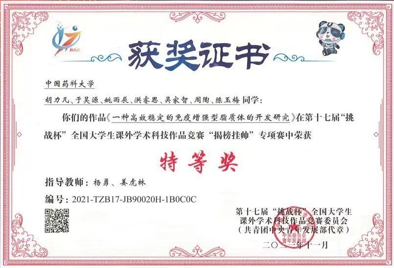 荣获“挑战杯”全国大学生课外学术科技作品竞赛专项赛特等奖