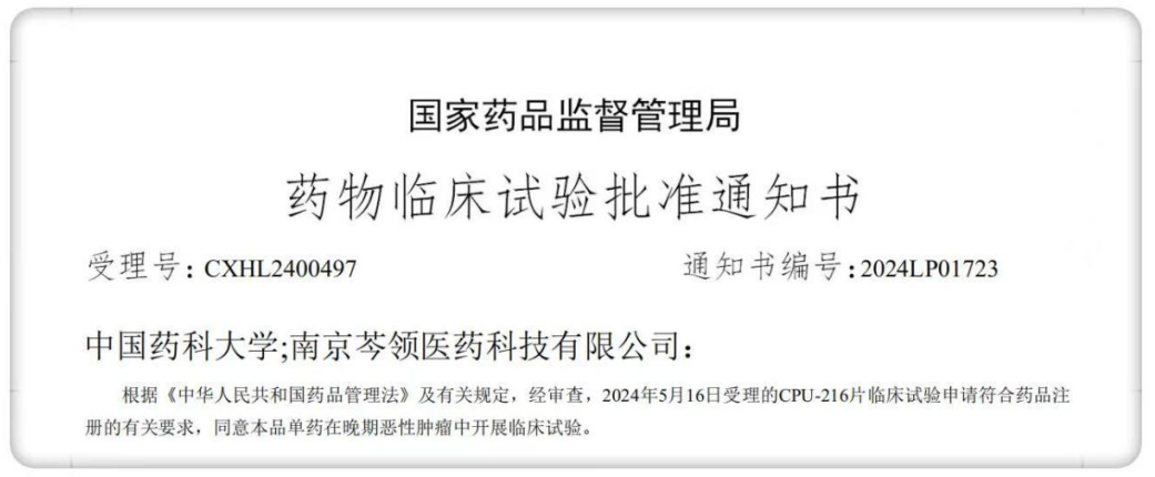 郭青龙教授合作研发CPU-216片获1类新药临床批件