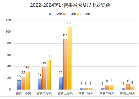 五年来,学院学生在外语类竞赛中屡创佳绩,展现出扎实的语言功底与卓越的综合应用能力。仅2024年,学院积极组织并参与各级各类外语竞赛21项,累计参与学生达5590人次,省级及以上级别赛事中获奖206人次,形成“以赛促学、以赛促练”的浓厚氛围,充分体现了学院外语教学质量与学生外语实战能力的持续提升。学生雷雅茹在全国英语演讲比赛中获奖并作为中方代表受邀参加省政府主办的中外青年活动,充分展现中国药大学子良好形象。