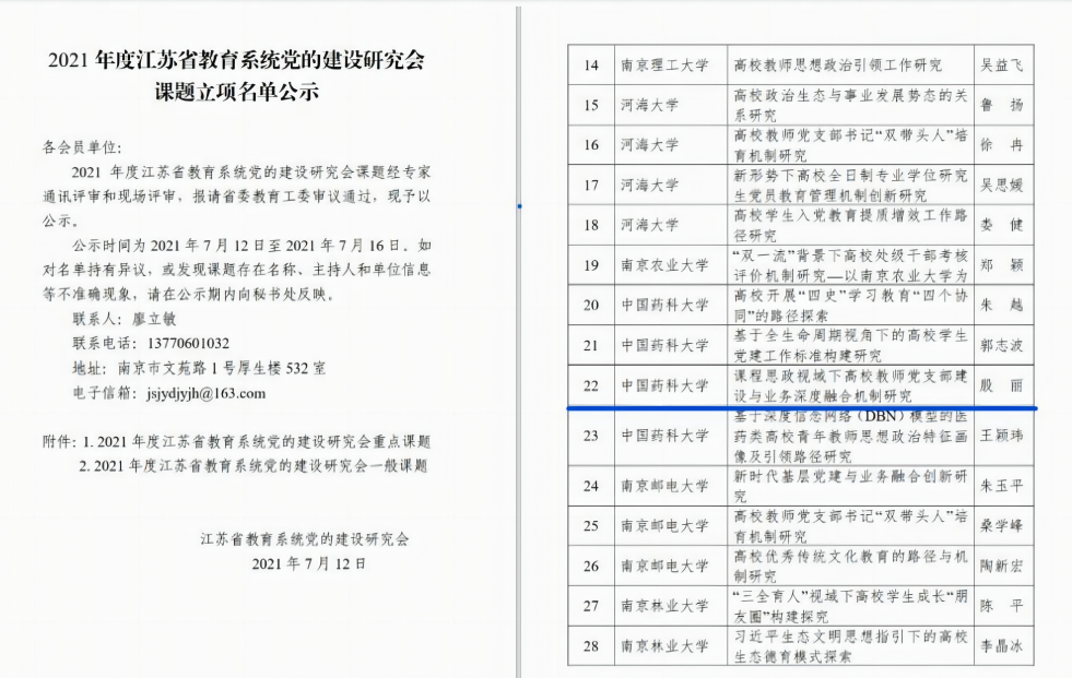 《课程思政视域下高校教师党支部建设与业务深度融合机制研究》获江苏省教育系统党的建设研究会课题立项