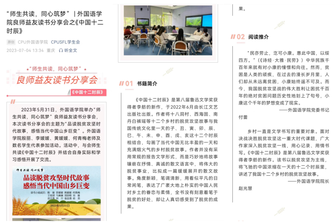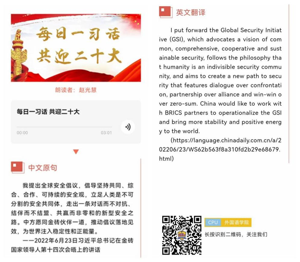 2022年9月10日,一篇由赵光慧院长朗读的中英双语版习近平总书记名言金句发布在了外国语学院微信公众号上。此后,陆续有70余篇用汉、英、法、日、俄等多语种朗诵的精选录音被学院官方公众号推送,形成了“日日有学习、人人能参与、时时受熏陶”的浓厚氛围。这是“每日一习话,共迎二十大”主题党日活动的重要成果之一。该活动聚焦传播核心思想、传达中国声音、培育时代新人三个维度,将习近平新时代中国特色社会主义思想与外语学科优势有机结合,实现了“党建+业务”双促双融。师生在诵读中深化了对党的先进理论和治国理政理念的理解,在翻译与表达中提升了专业能力,在思考与交流中增强了文化自信与政治认同,真正做到了学思用贯通、知信行统一。