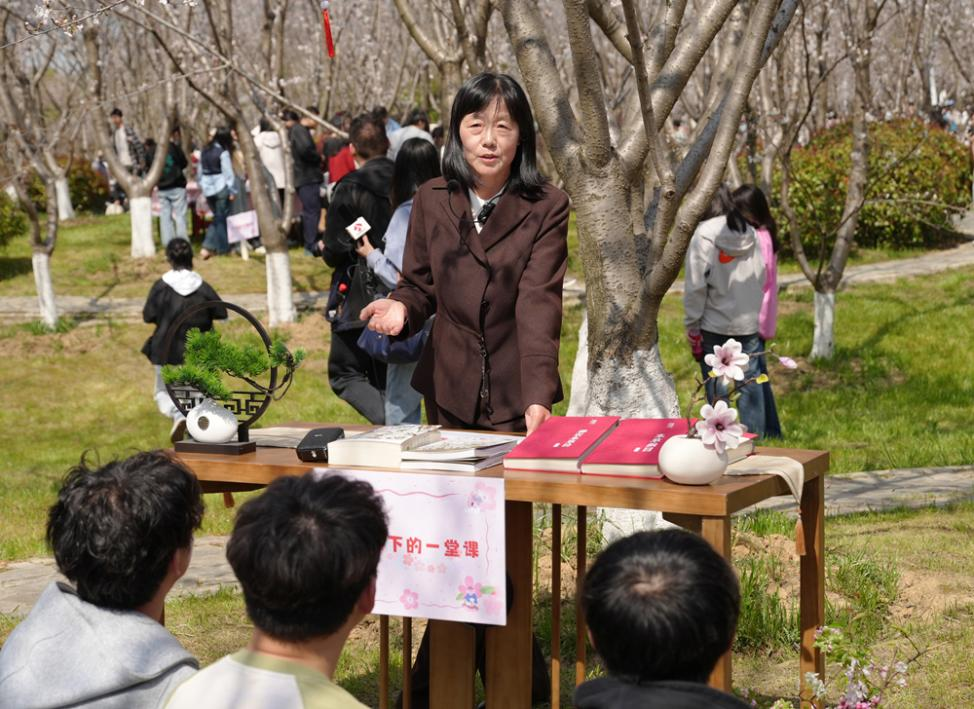 “樱花起源于中国。先秦时期,樱花还是喜马拉雅山脚下的一种野花。经过我们伟大先祖的人工栽培,樱花开始逐渐流向中原地区……”为什么樱花丛中会传来老师授课的声音?原来,这是中药学院王旭红教授主讲的“樱花树下的一堂课”。