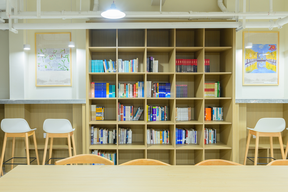 午后的阳光透过玻璃窗,沿着白色纱帘静静地洒在原木材质的桌面上。书柜倚墙伫立,《古文辞类纂》《西方哲学史》等各类书籍琳琅满目。吧台上的多肉植物妙趣横生,袅袅琴音中,书卷气和艺术感完美融合。